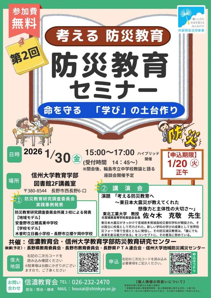 Posted inイベント 【1月30日】第2回防災教育セミナー開催 Posted by admin 2026年1月5日 第2回防災教育セミナーが1月30日(金)に開催せれます。詳しくは以下をご覧ください。 admin View All Posts Post navigation Previous Post 【12月13日、14日開催】信州型避難所システム実働訓練の実施のお知らせNext Post【2/20開催】令和7年度 防災学習成果発表会のお知らせ